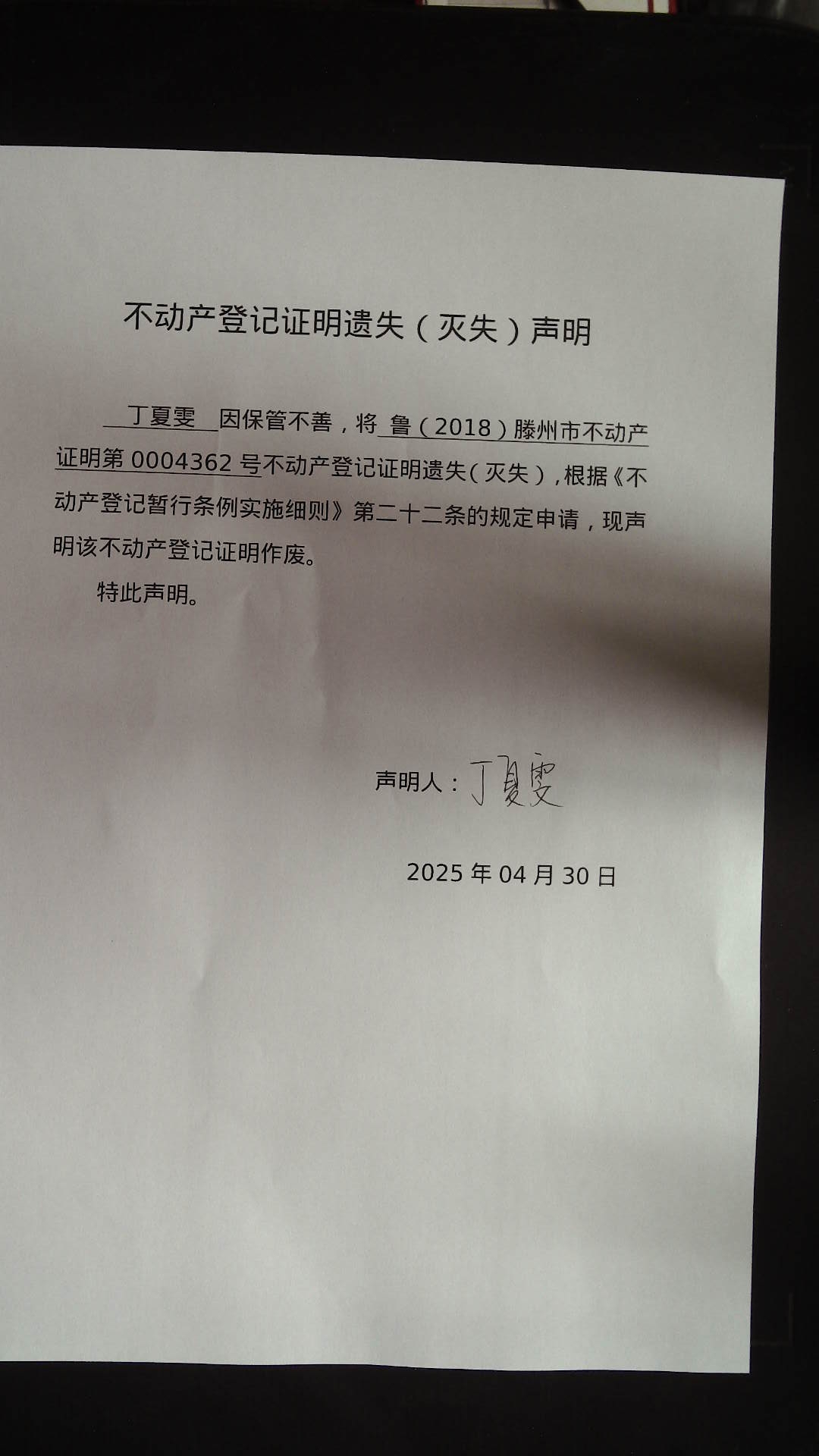 滕州市自然資源局不動產權證書遺失(滅失)聲明
