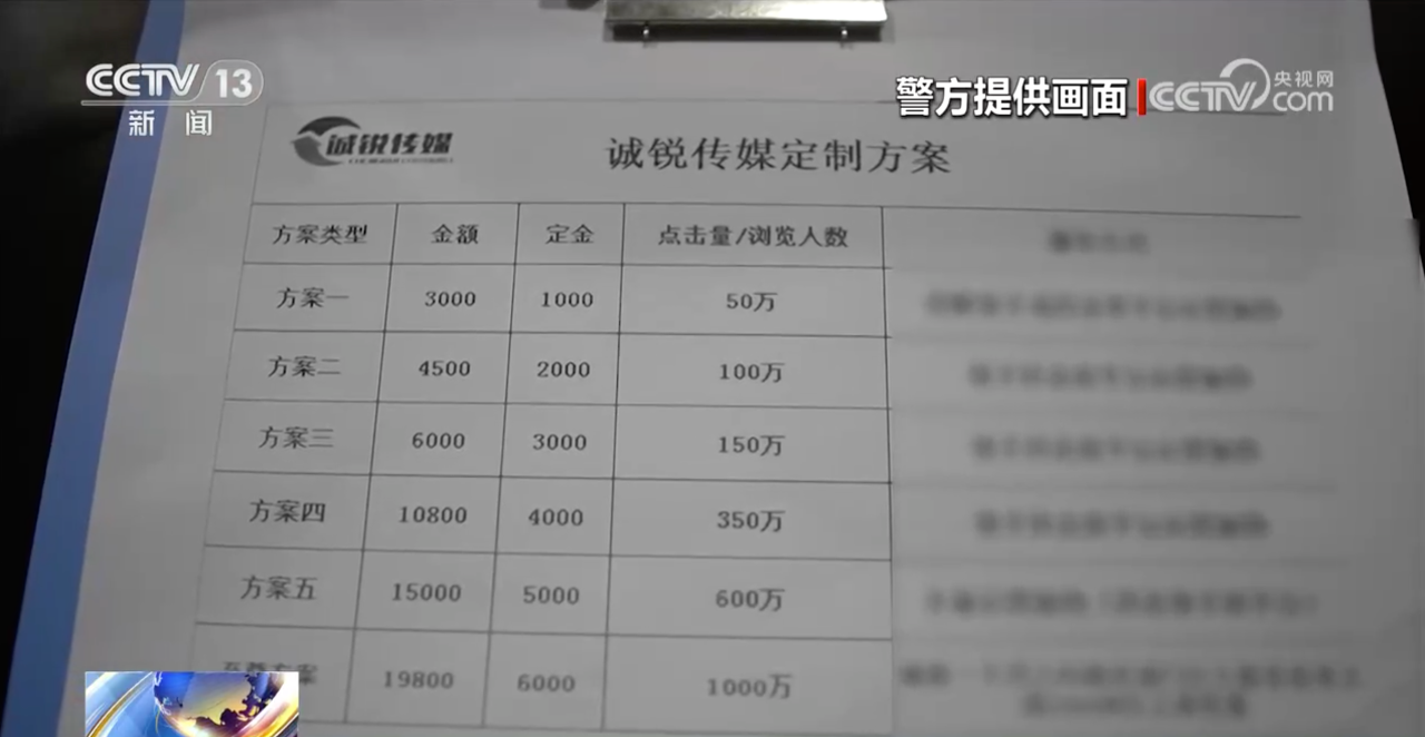 警方介紹,這些公司定價不一,分為多個檔位。最低為50萬瀏覽量,收費在2500元到3000元之間。然后,依次為100萬、150萬、350萬、600萬的瀏覽量,最高是1000萬瀏覽量,需要支付19800元。